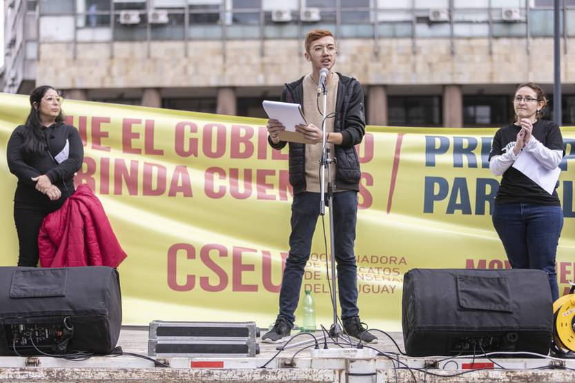 Bruno Volpi, durante el acto de los gremios de la enseñanza frente a Torre Ejecutiva.