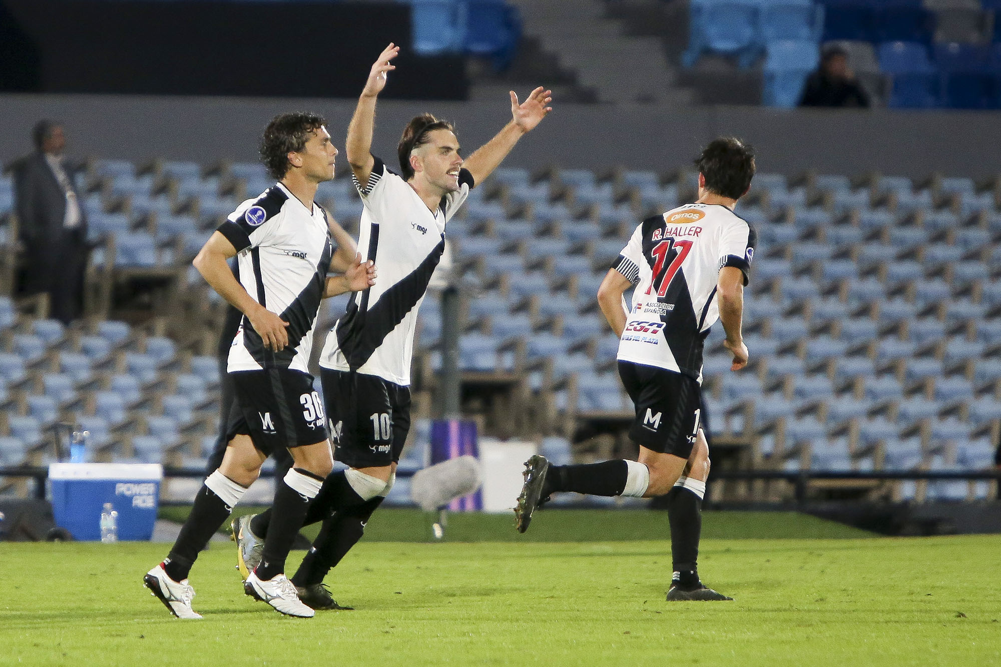 Sebastián Fernández, Guillermo May, y Rafael Haller, durante el festejo de May, en el partido ante Huracán, el 8 de junio, en el estadio centenario.