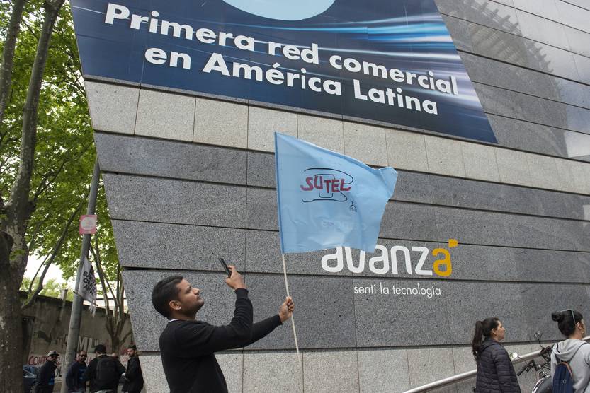 Movilización de Sutel, en la Torre de las Telecomunicaciones, en Montevideo (archivo, octubre de 2021).