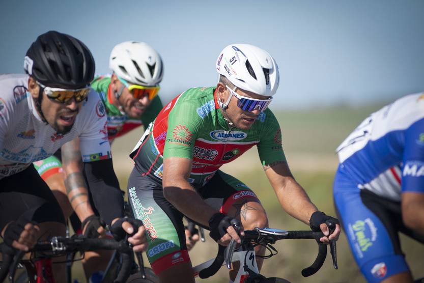 Fernando Méndez (C), del club San Antonio, durante la tercera etapa de la 78ª Vuelta Ciclista del Uruguay