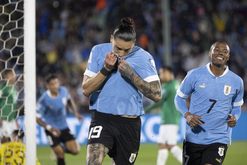 Darwin Núñez y Nicolás de la Cruz, el 21 de noviembre durante el partido ante Bolivia, en el estadio Centenario.