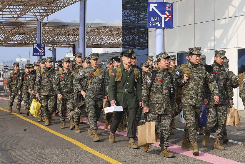 Militares surcoreanos luego de que un viaje en ferry a la isla de Baengnyeong fuera cancelado por disparos de fuego de artillería de Corea del Norte cerca de dos islas de Corea del Sur.