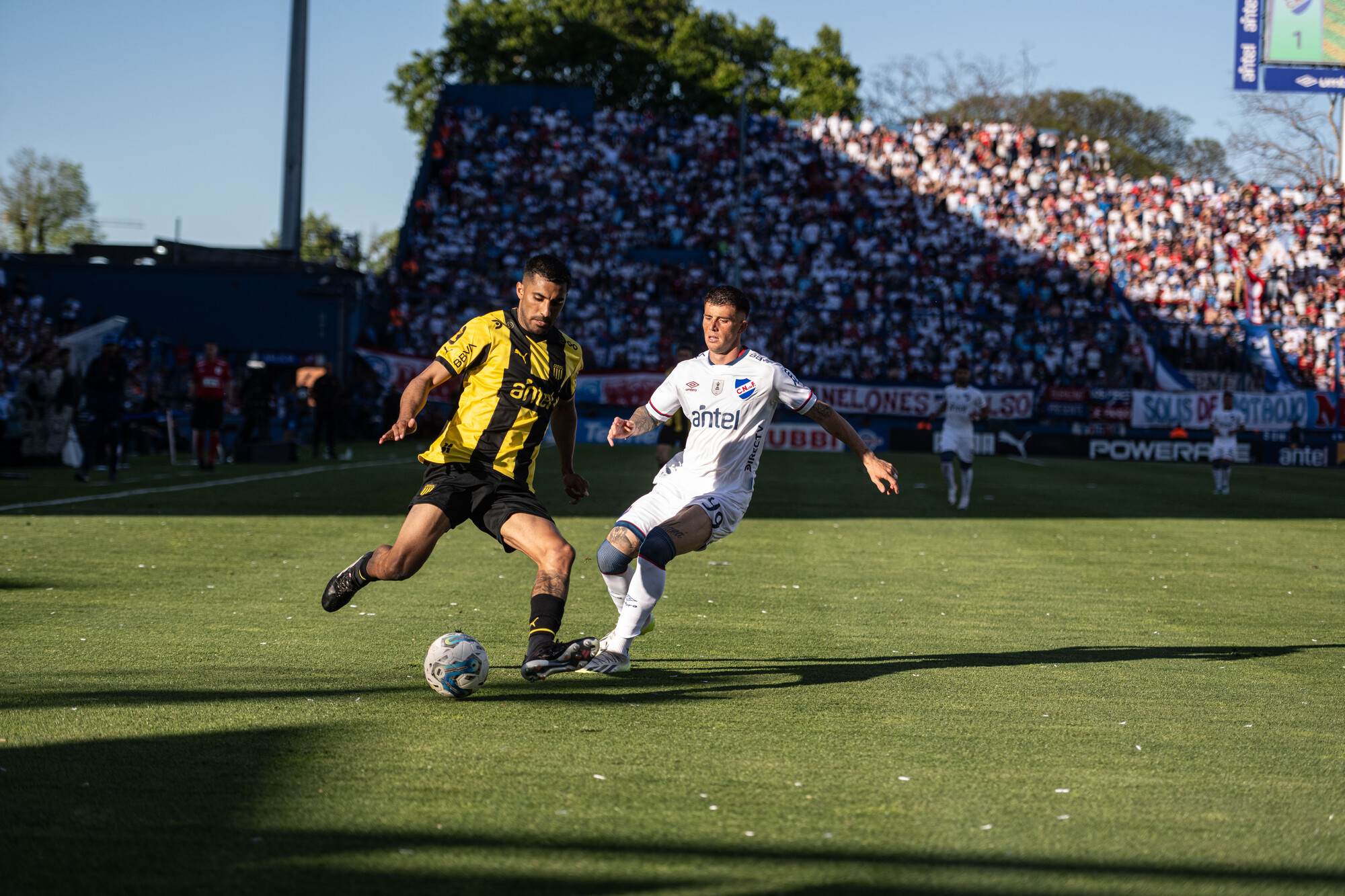 Maximiliano Olivera, de Peñarol, y Juan Ignacio Ramírez, de Nacional, durante el clásico del 11 de noviembre de 2023, en el Gran Parque Central.