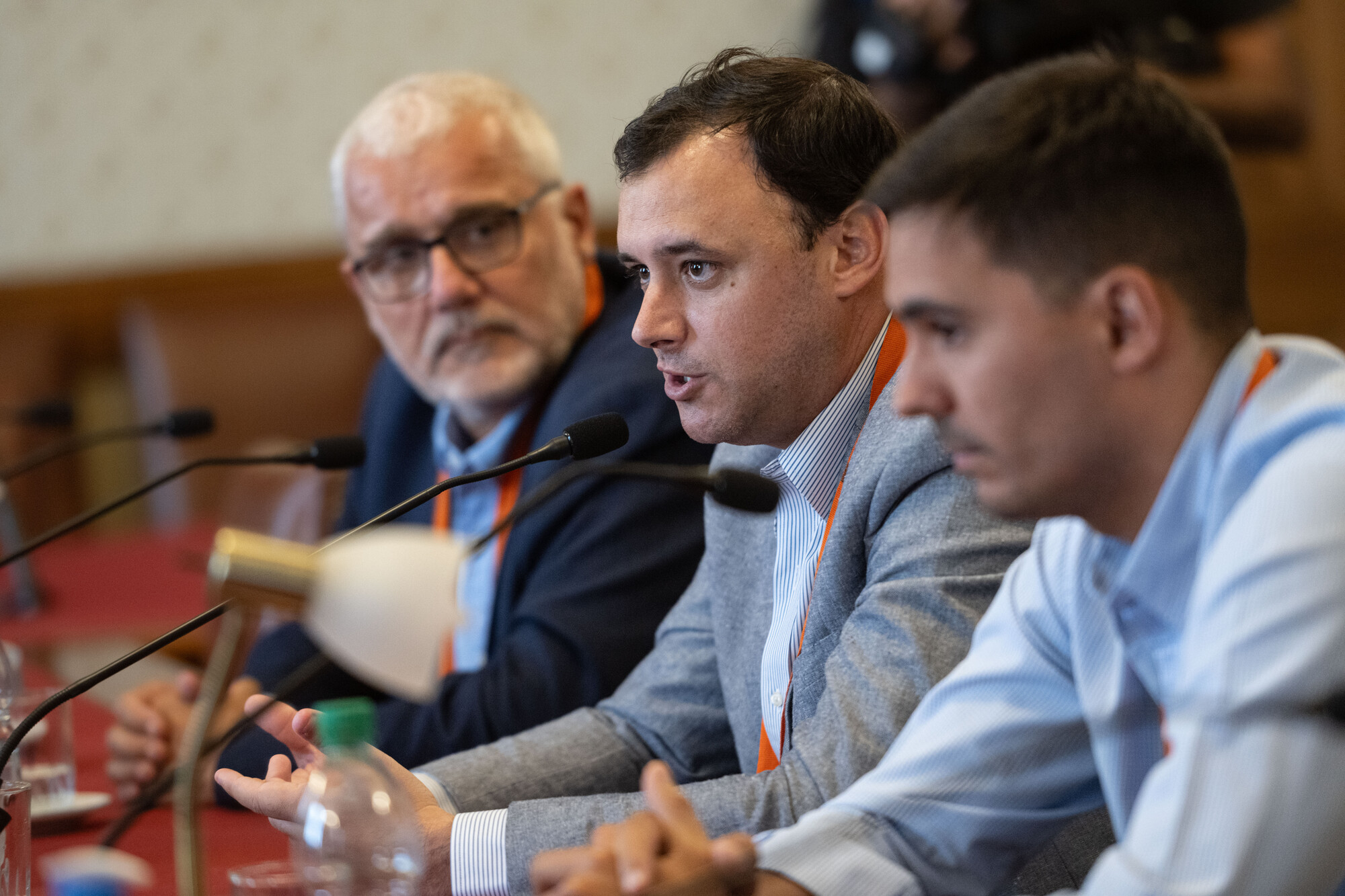 Juan Muxi, gerente general de PedidosYa Uruguay, y Rodrigo Turturiello, abogado, el 15 de febrero, en el Parlamento.