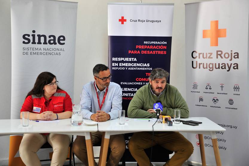 Paula Vairoletti, Daniel Pirotto y Santiago Caramés durante una conferencia de prensa, el 12 de abril, en la sede de Cruz Roja.