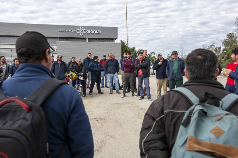 Asamblea de trabajadores de Granja Pocha en el acceso a la planta industrial, el 10 de mayo.