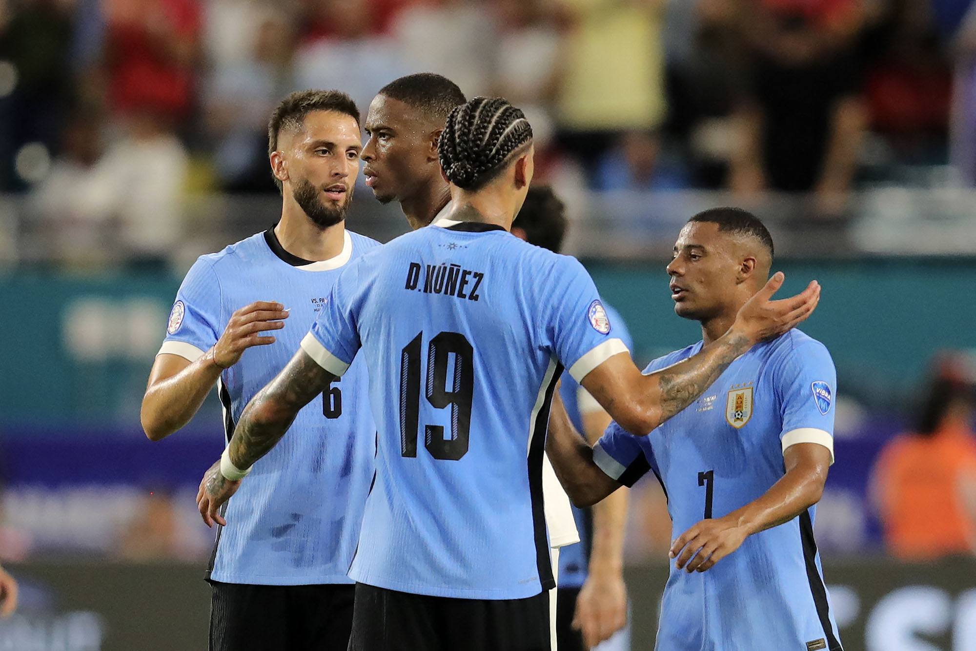 Rodrigo Bentancur, Darwin Núñez y Nicolás de la Cruz, al finalizar el partido ante Panamá por la Copa América, el domingo 23 de junio, en el estadio Hard Rock de Miami. Foto: Chris Arjoon, AFP.