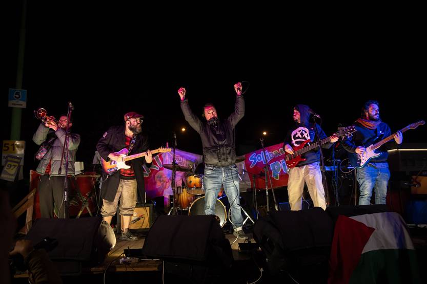 Fermín Muguruza junto a Cuatro pesos de propina, durante la movilización por la masacre del filtro, a 30 años del suceso.