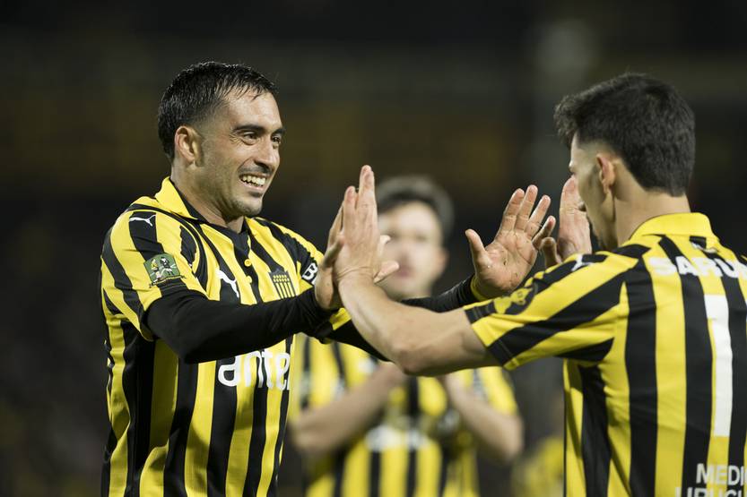 Jaime Báez, de Peñarol celebra su gol ante Rampla Juniors.
