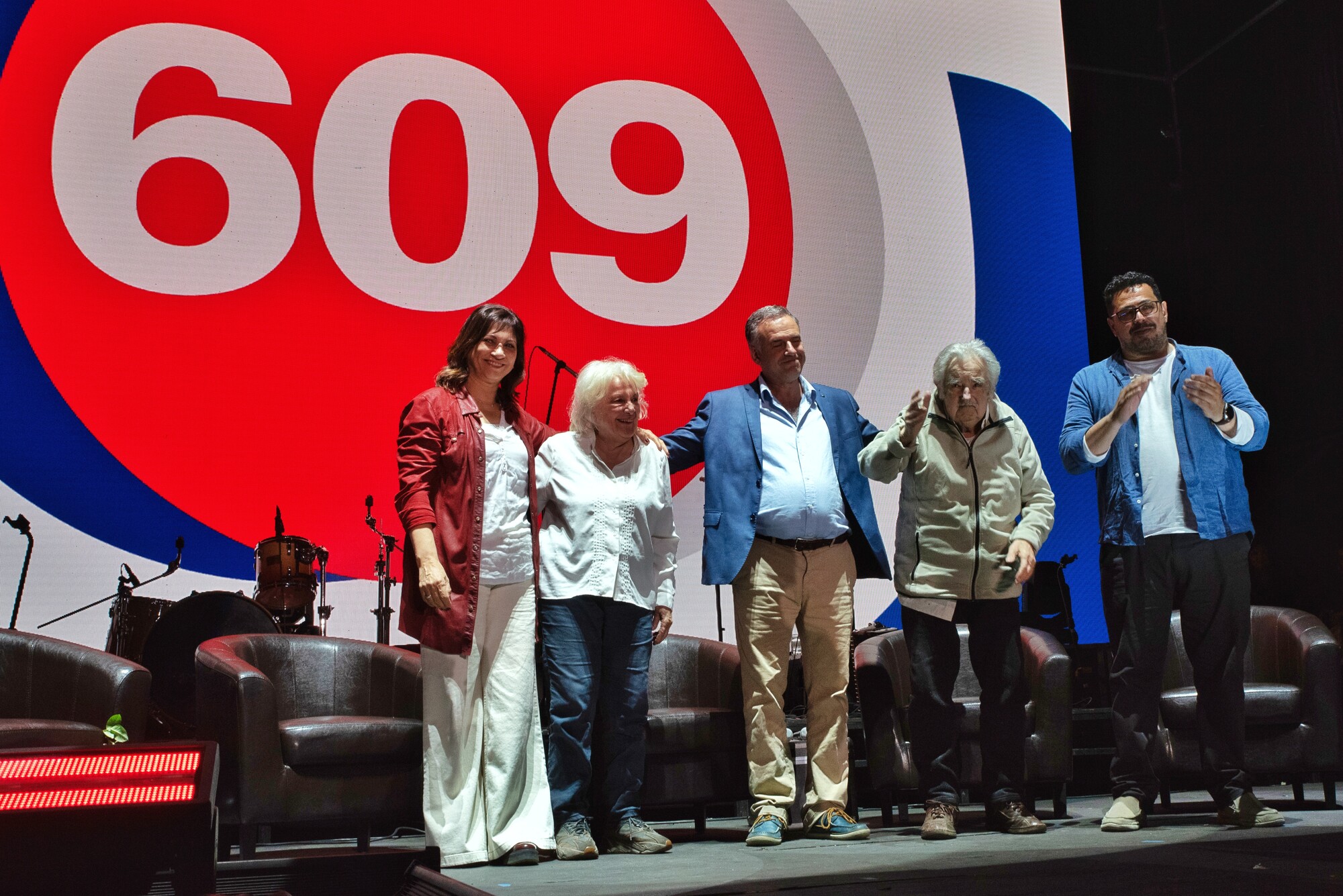 Blanca Rodríguez, Lucía Topolansky, Yamandú Orsi, José Mujica y Alejandro Sánchez, durante el acto de cierre de campaña del MPP, en la plaza Primero de Mayo.