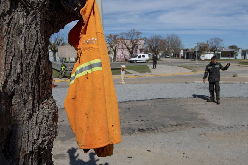 Trabajos de repavimentación de la empresa subcontratada por Abengoa Teyma, frente al sanatorio Camec y el monumento a Las Manos, en Juan Lacaze (archivo, setiembre de 2024).