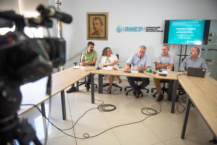 Gonzalo Irigoyen, Fernanda Alanís, Julián Mazzoni, Daniel Devitta y Walter Fernández Val, el 12 de diciembre, durante la conferencia de prensa en el edificio de la ANEP, en Montevideo.