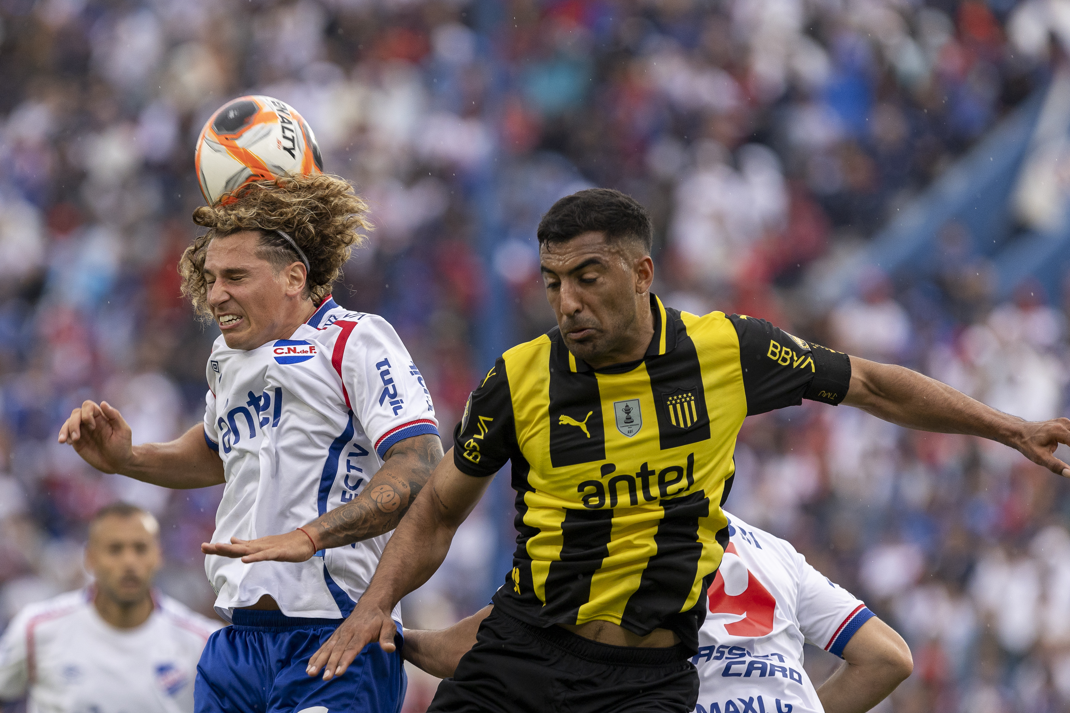 Luciano Boggio, de Nacional, y Maximiliano Olivera, de Peñarol, el 30 de noviembre de 2025, en el Gran Parque Central.