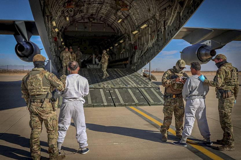 Funcionarios federales abordando a migrantes detenidos en un vuelo a la Base Naval de la Bahía de Guantánamo, desde un lugar no revelado, 4 de febrero, en Estados Unidos.