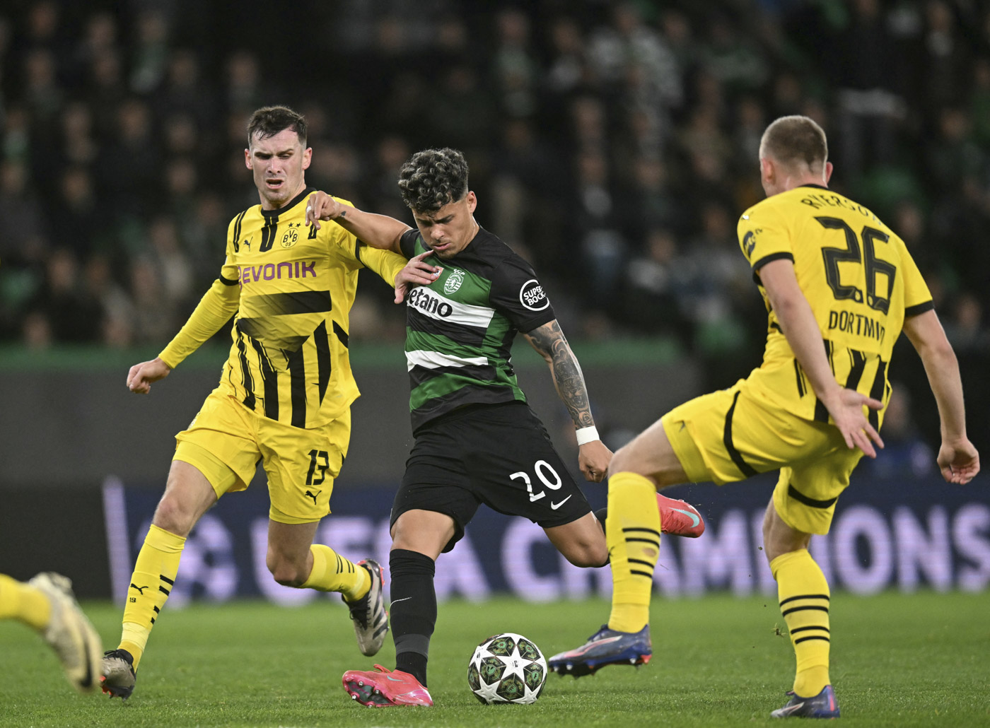 Pascal Gross, de Borussia Dortmund, Maximiliano Araújo, de Sporting de Lisboa, y Julian Ryerson, de Borussia Dortmund, en el estadio Alvalade de Lisboa.