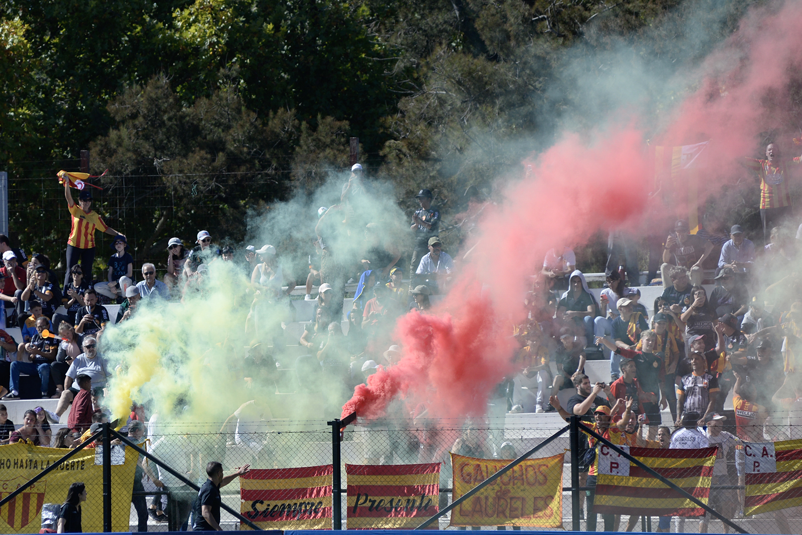 Hinchada de Progreso durante un partido en el Parque Viera (archivo, abril de 2023).