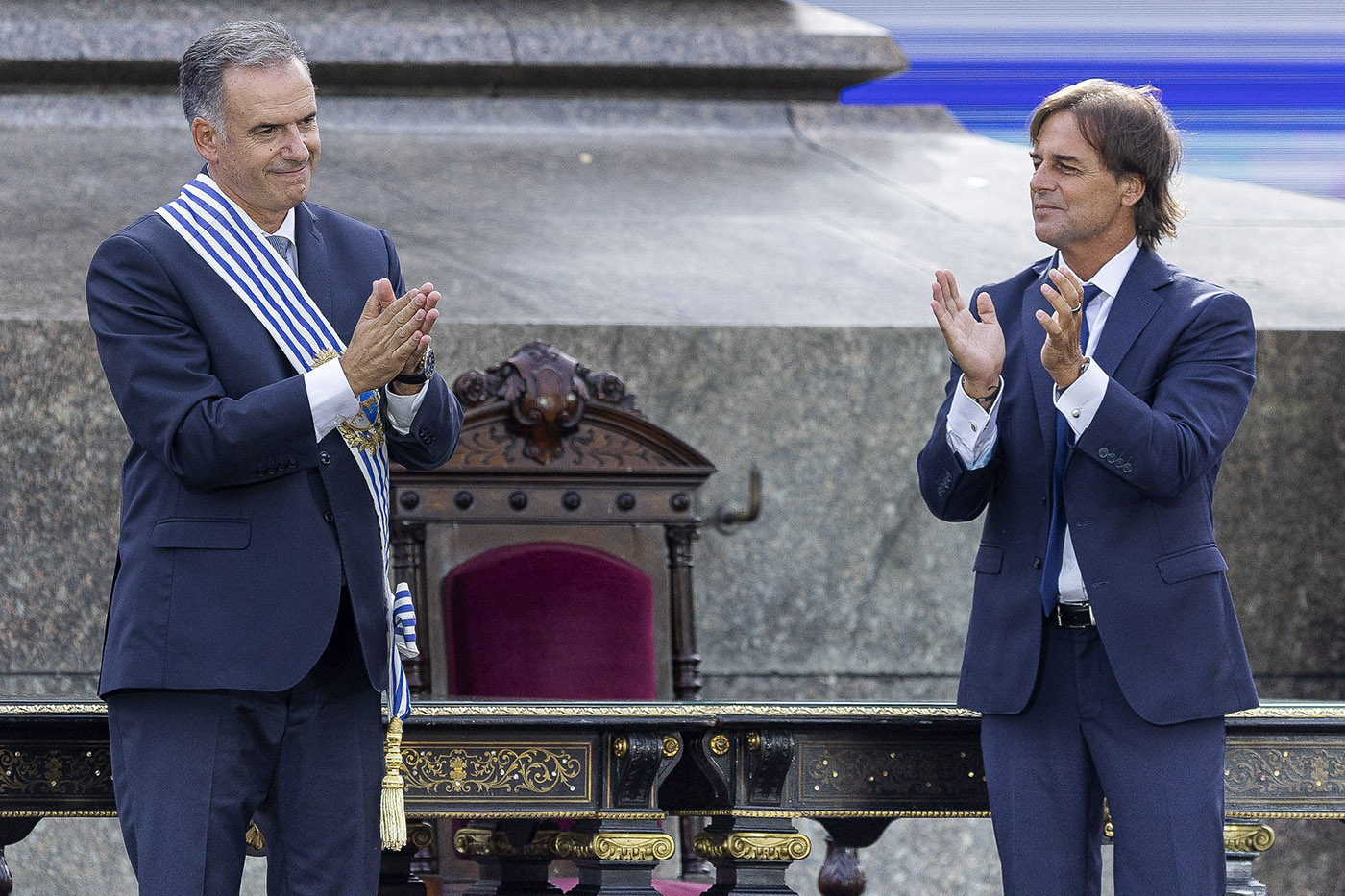 Yamandú Orsi y Luis Lacalle Pou, tras el traspaso de la banda presidencial en plaza Independencia.