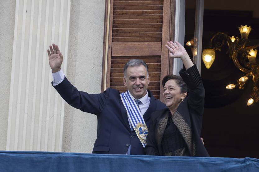 Yamandú Orsi y Laura Alonsopérez, el 1° de marzo, en el balcón del Palacio Estévez.