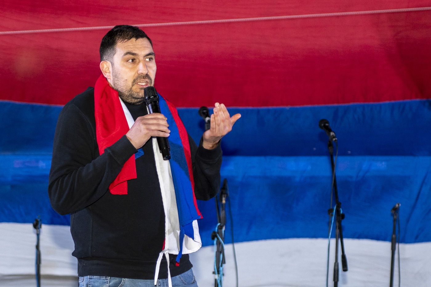 Marcos Musselli, durante la campaña electoral en el comité Jorge Perrou de Tarariras. (archivo, setiembre de 2024)