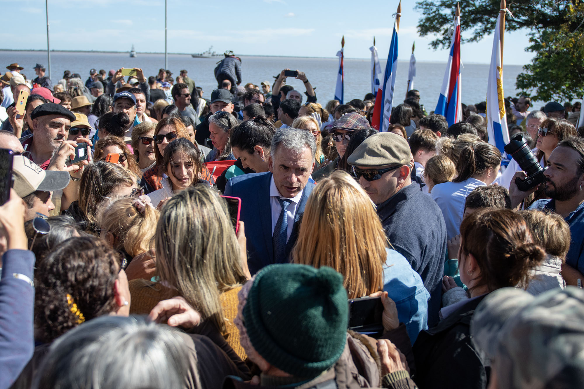 Yamandú Orsi, durante el acto por los 200 años del desembarco de los 33 Orientales, el sábado 19 de abril, en la playa de la Agraciada, Soriano.