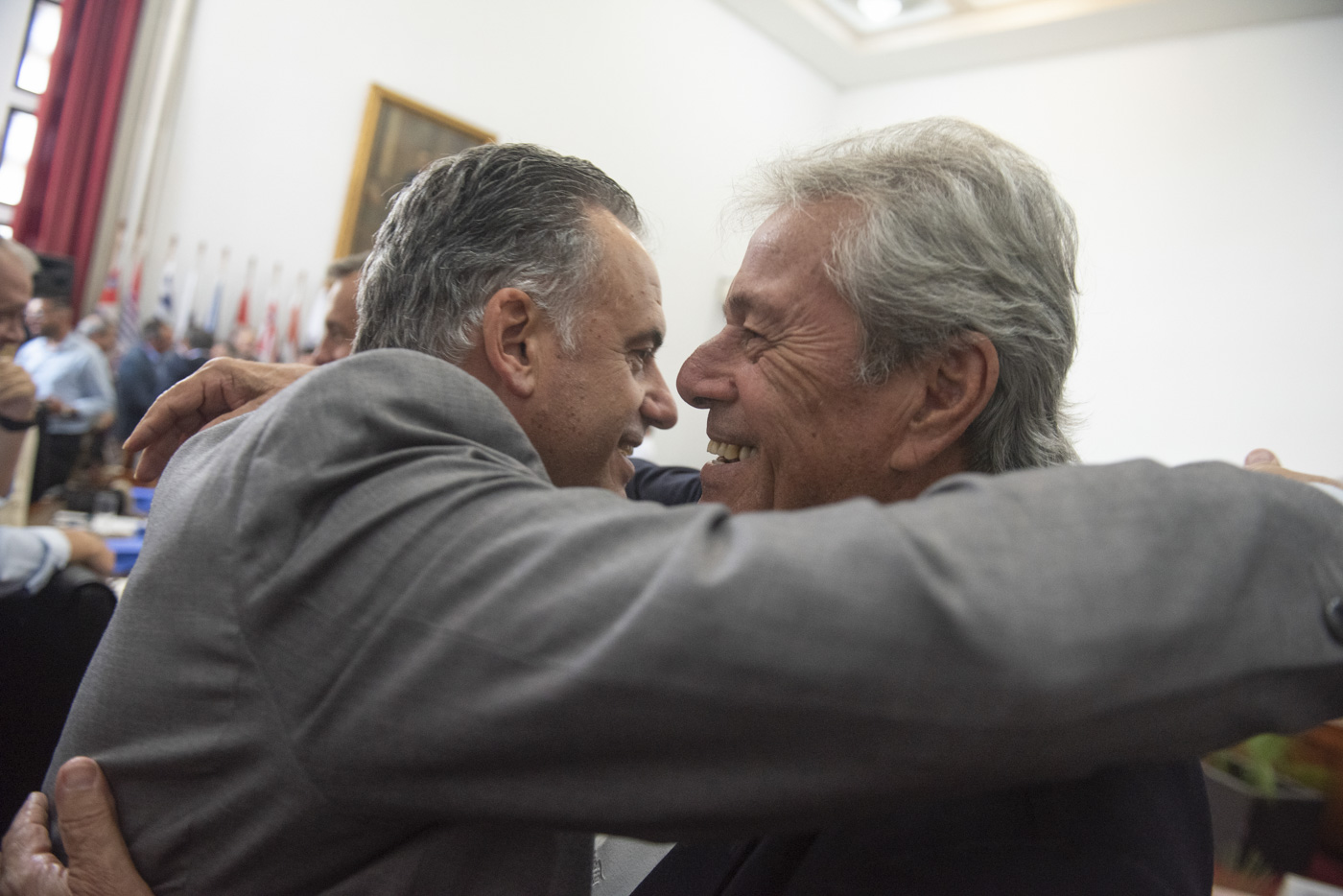 Yamandú Orsi y Enrique Antía, cuando el presidente electo visitó el Congreso de Intendentes, el 6 de febrero.