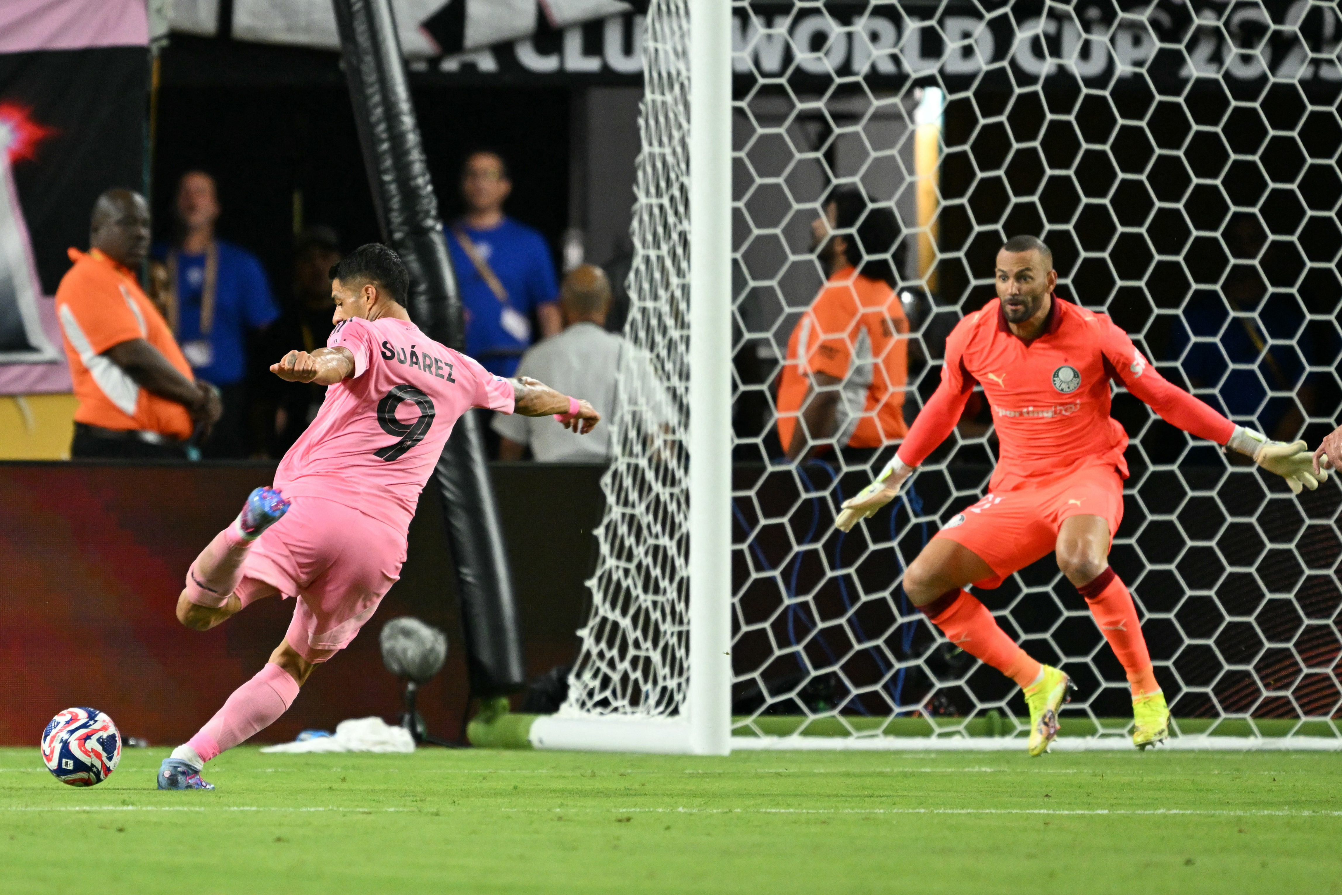 Luis Suárez, previo a convertir su gol ante Palmeiras, el 23 de junio, en el estadio Hard Rock de Miami. Foto: Chandan Khanna, AFP.