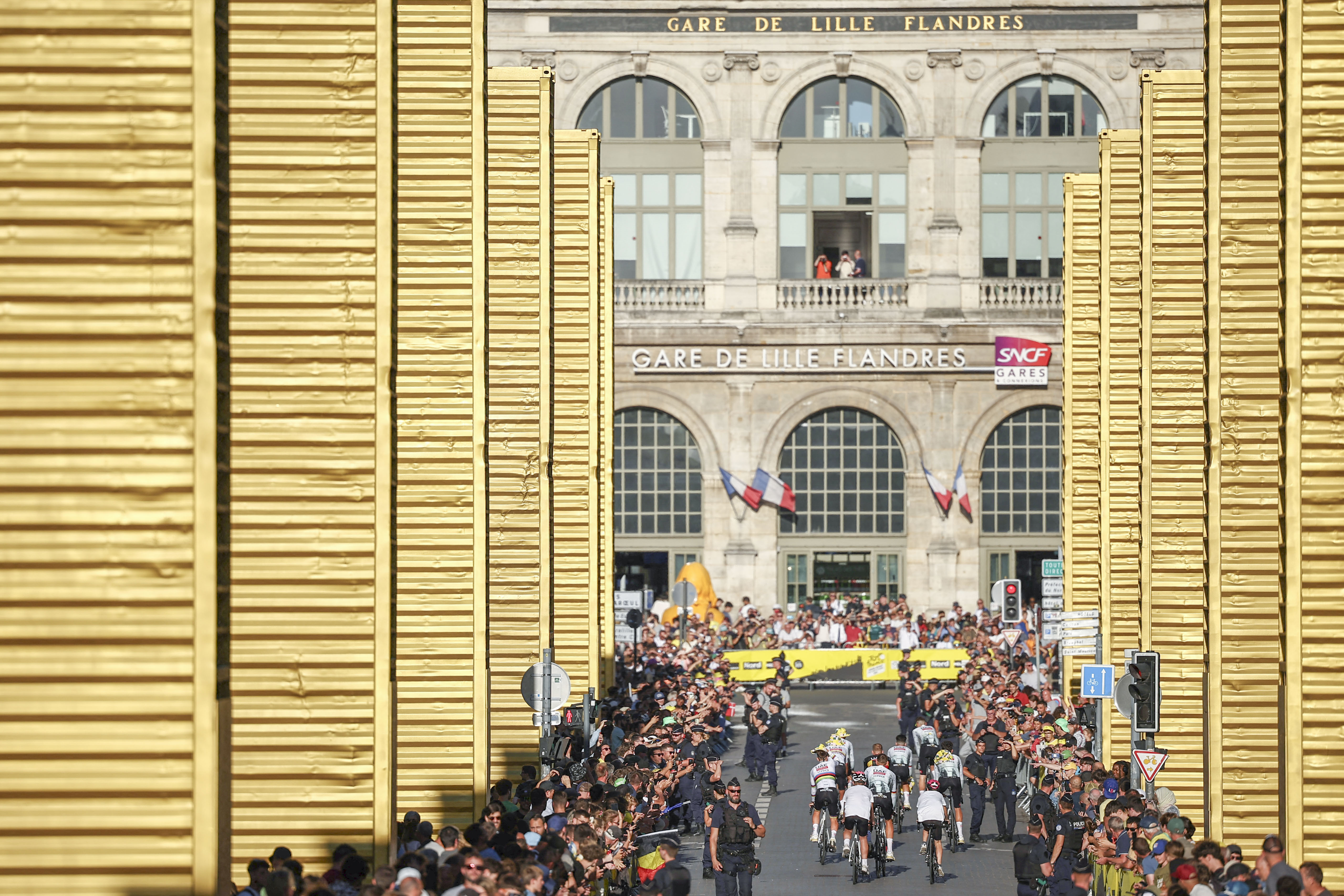 Ciclistas del UAE Team Emirates - XRG recorren el centro de Lille ,durante la presentación oficial del equipo, días antes del inicio de la 112ª edición del Tour de Francia, en Lille, norte de Francia, el 3 de julio.