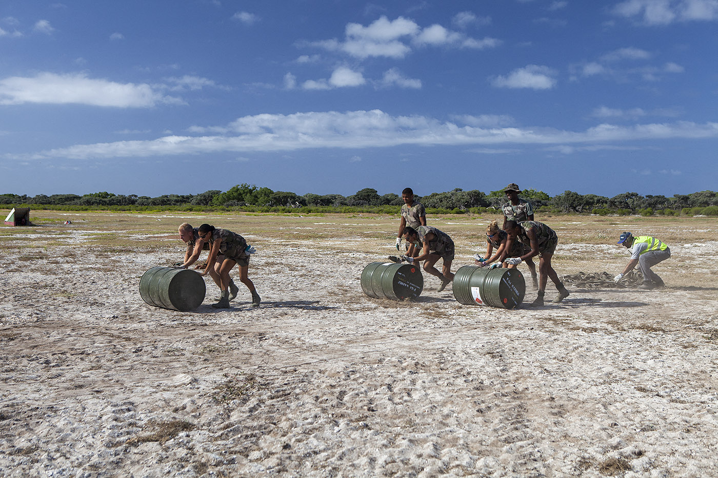 Miembros del 2º destacamento RPIMA trabajan con abastecimiento para el campamento militar en el Canal de Mozambique, Islas Dispersas el 9 de abril de 2014.