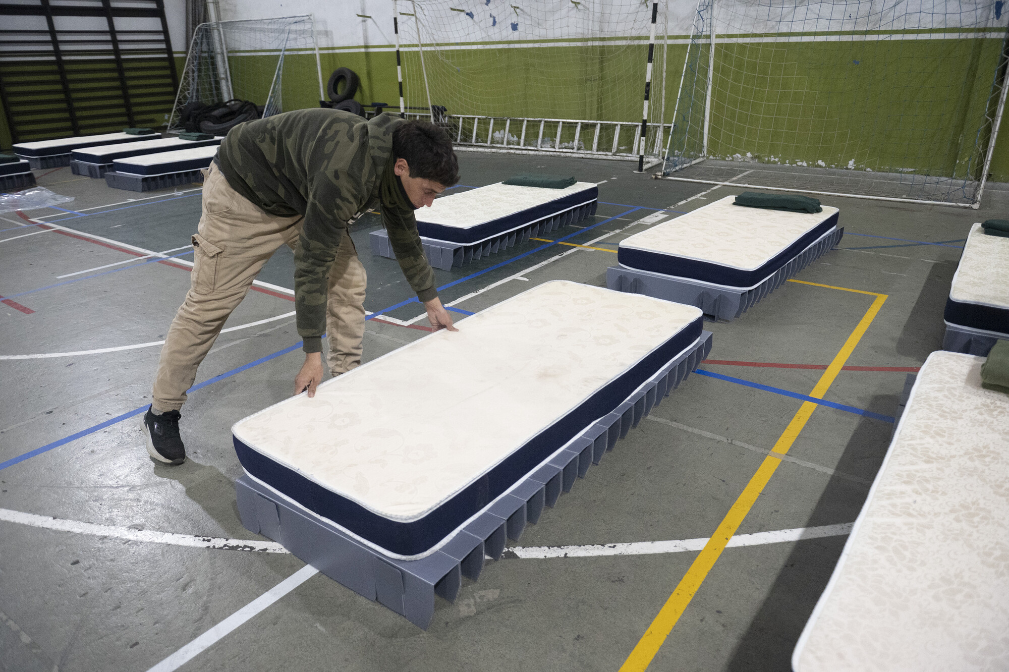 Trabajadores de SINAE arman camas en el Gimnasio de la plaza de de deportes N° 2, en Gral Flores y Amezaga, en Montevideo.