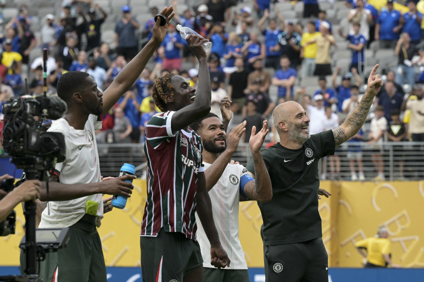 Jugadores y técnico de Chelsea tras la victoria ante Fluminense en la semifinal de la Copa Mundial de Clubes en el estadio MetLife de Nueva Jersey.