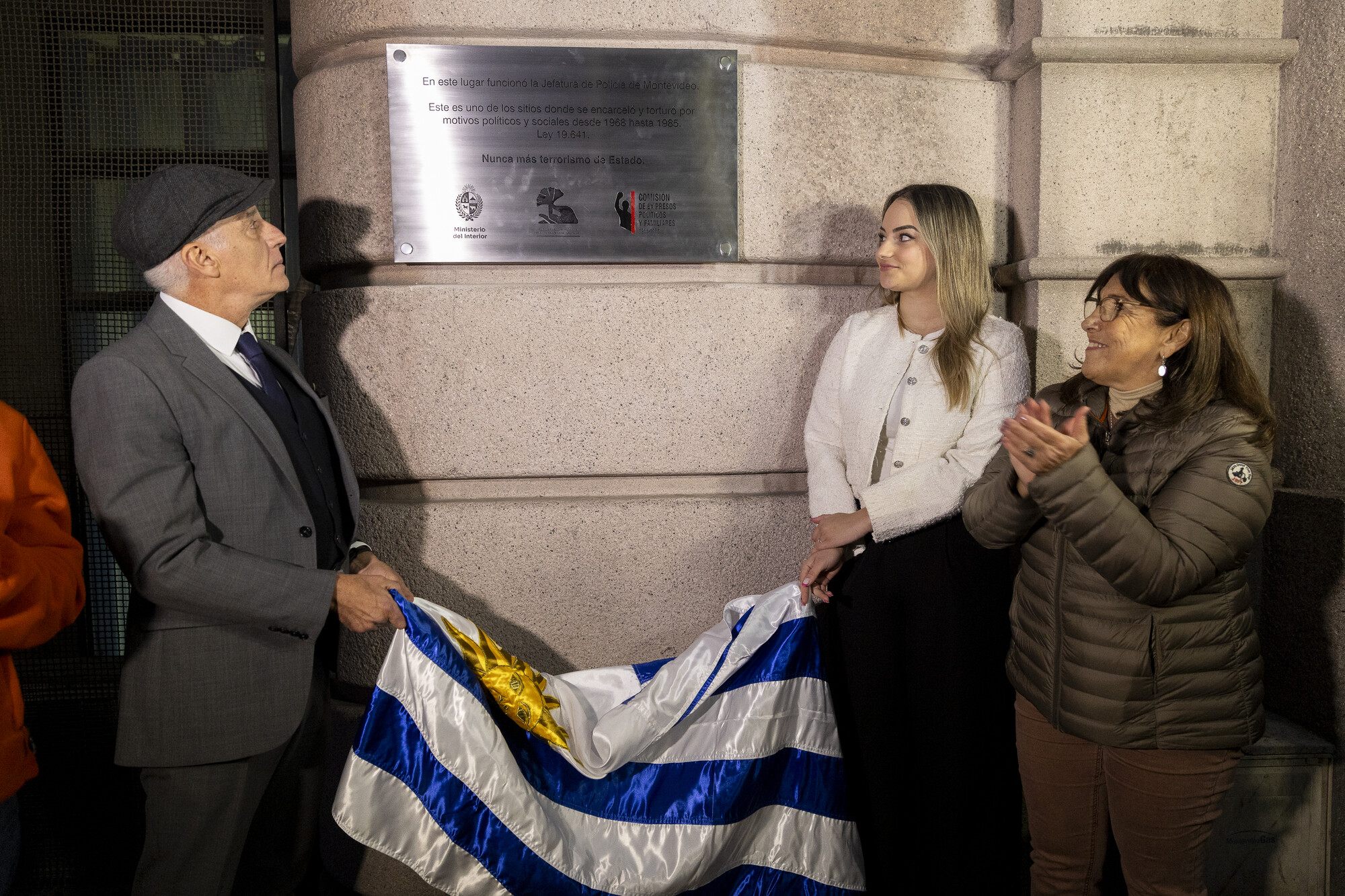 Carlos Negro, Maite Camera y María Celia Robaina, el 10 de julio, en la colocación de la Placa a la Memoria en la ex Jefatura y Carcel Central de Montevideo.
