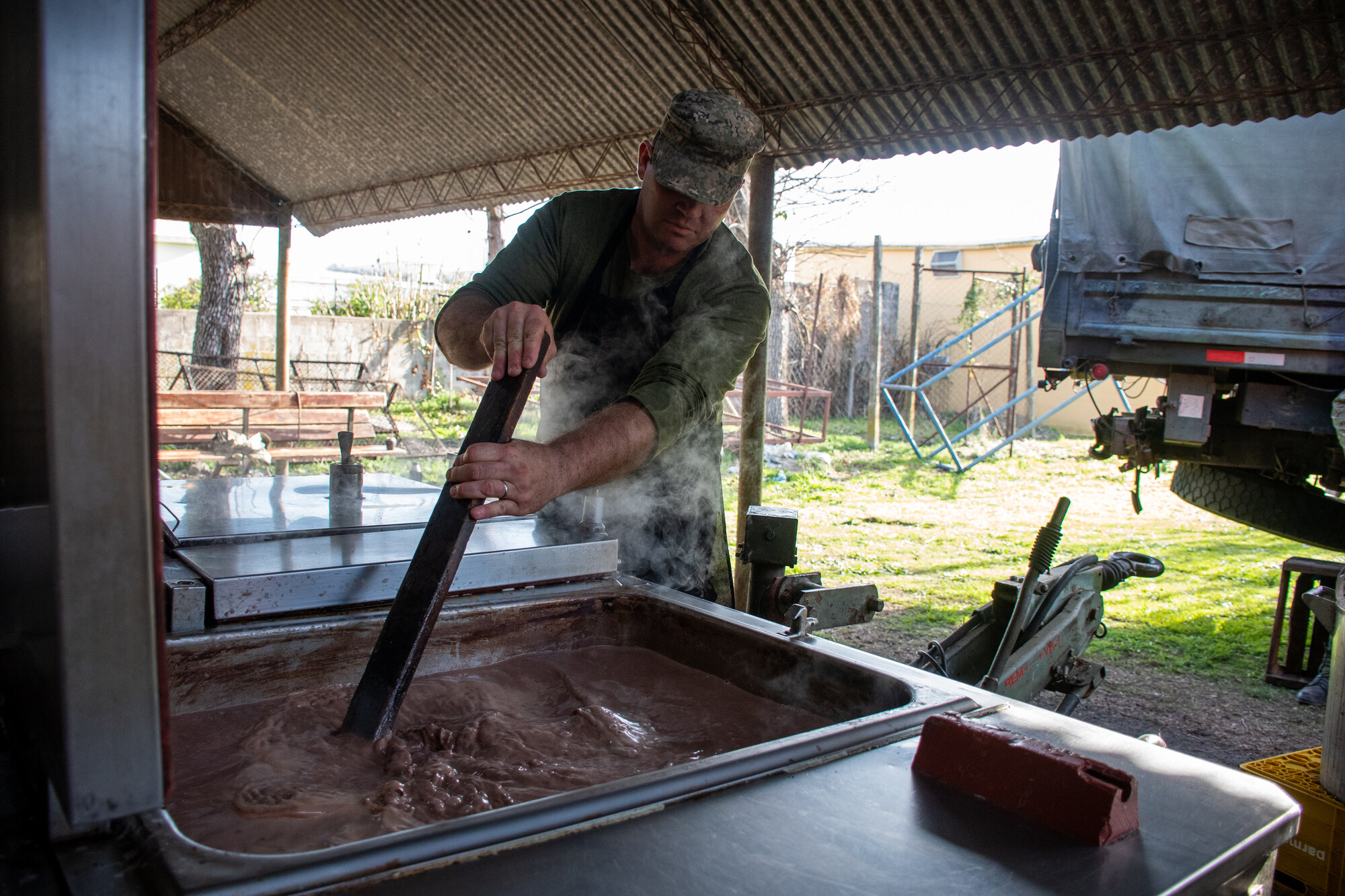 Militares del Batallón 4 de Colonia, realizando chocolate para la Fiesta del Chocolate, en Nueva Helvecia.