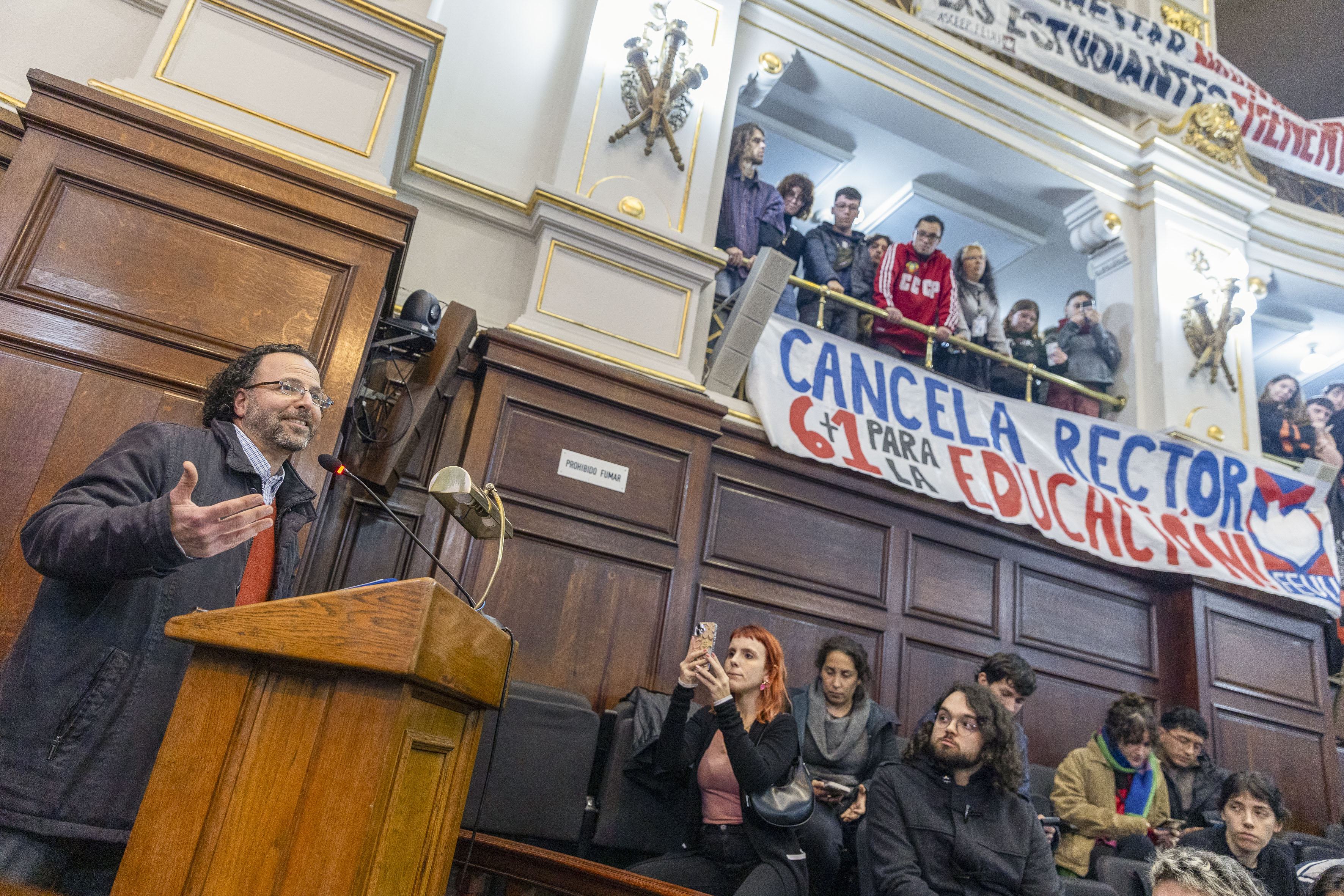 Héctor Cancela, el 16 de julio, en el Paraninfo de la Udelar.