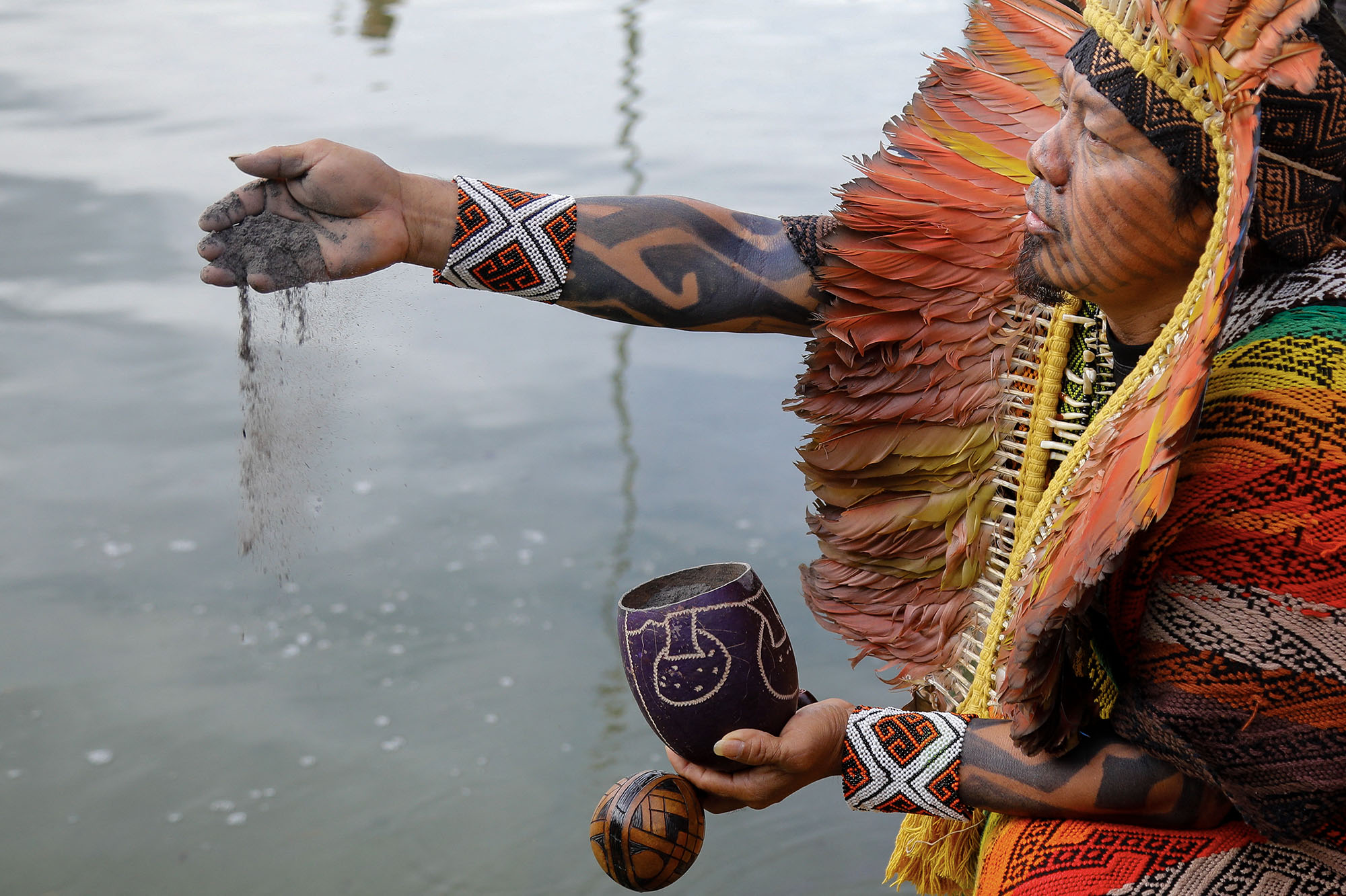 Un indígena arroja cenizas de la quema de la Amazonia en el Ministerio de Relaciones Exteriores de Brasil, el 15 de abril.