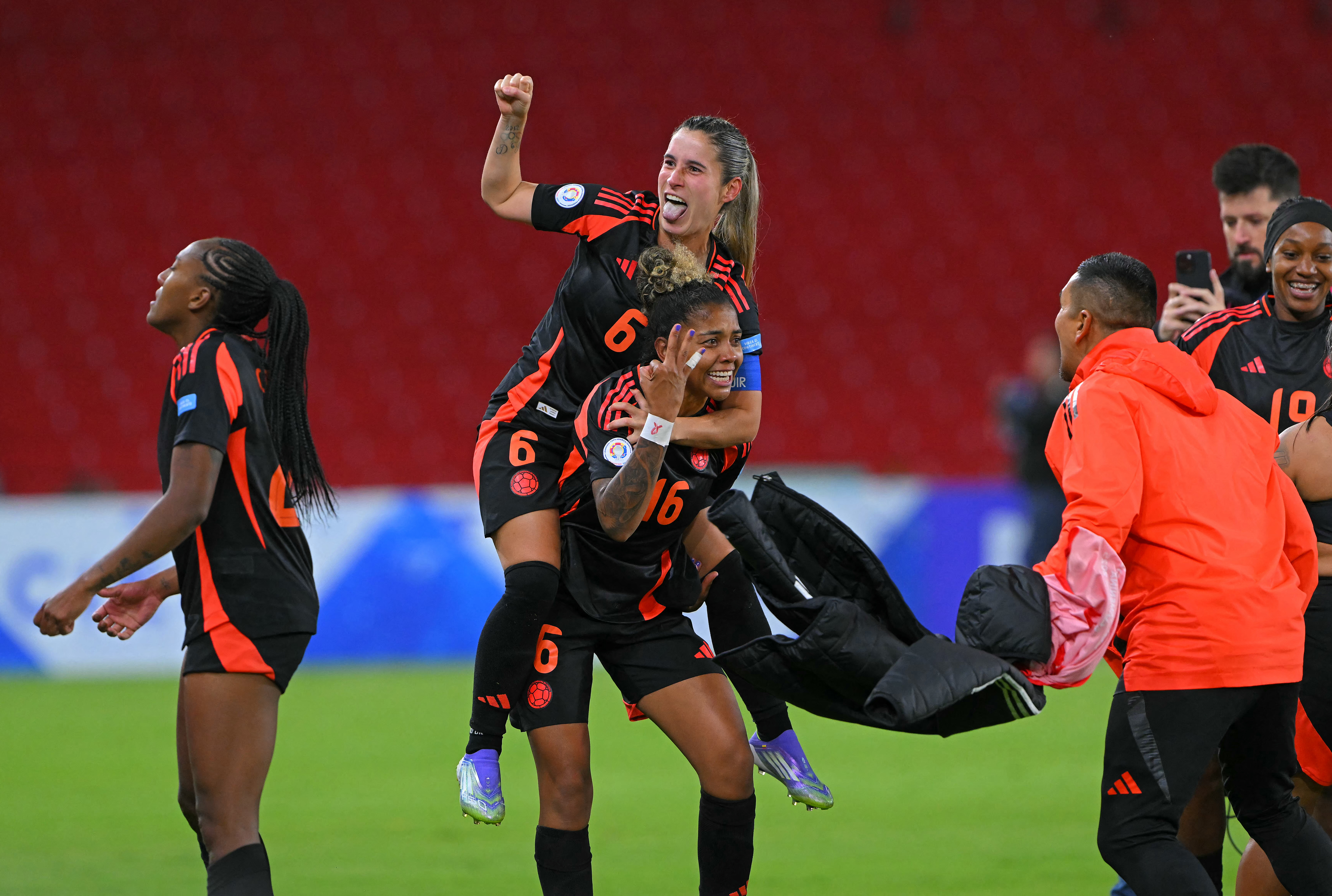 La selección de Colombia celebra la victoria ante Argentina, el 28 de julio, en el estadio Rodrigo Paz Delgado de Quito.