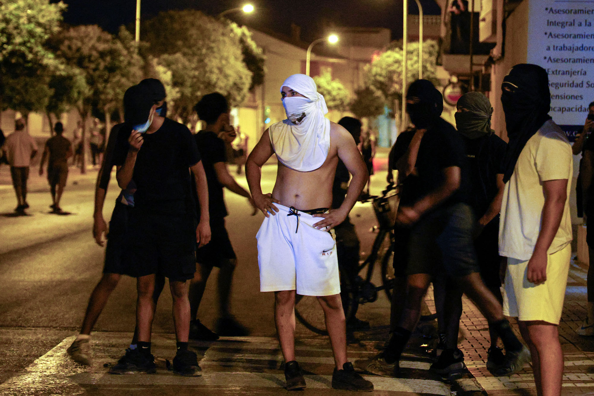 Residentes se congregan en la calle, luego de tres días de disturbios, el 14 de julio, en Torre Pacheco, Murcia, España.