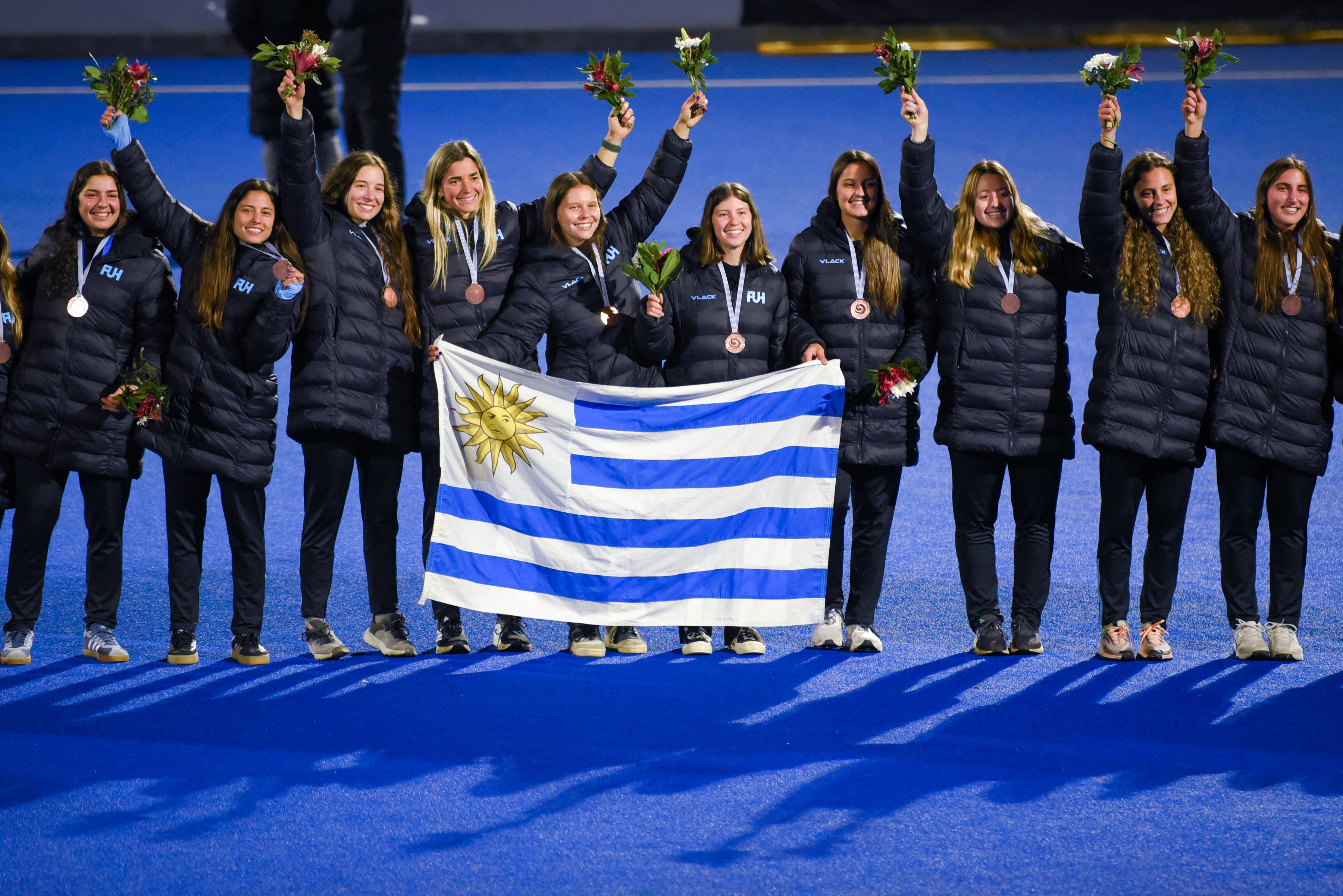 Jugadoras de Uruguay, el 3 de agosto, durante la premiación, en la Cancha Celeste.