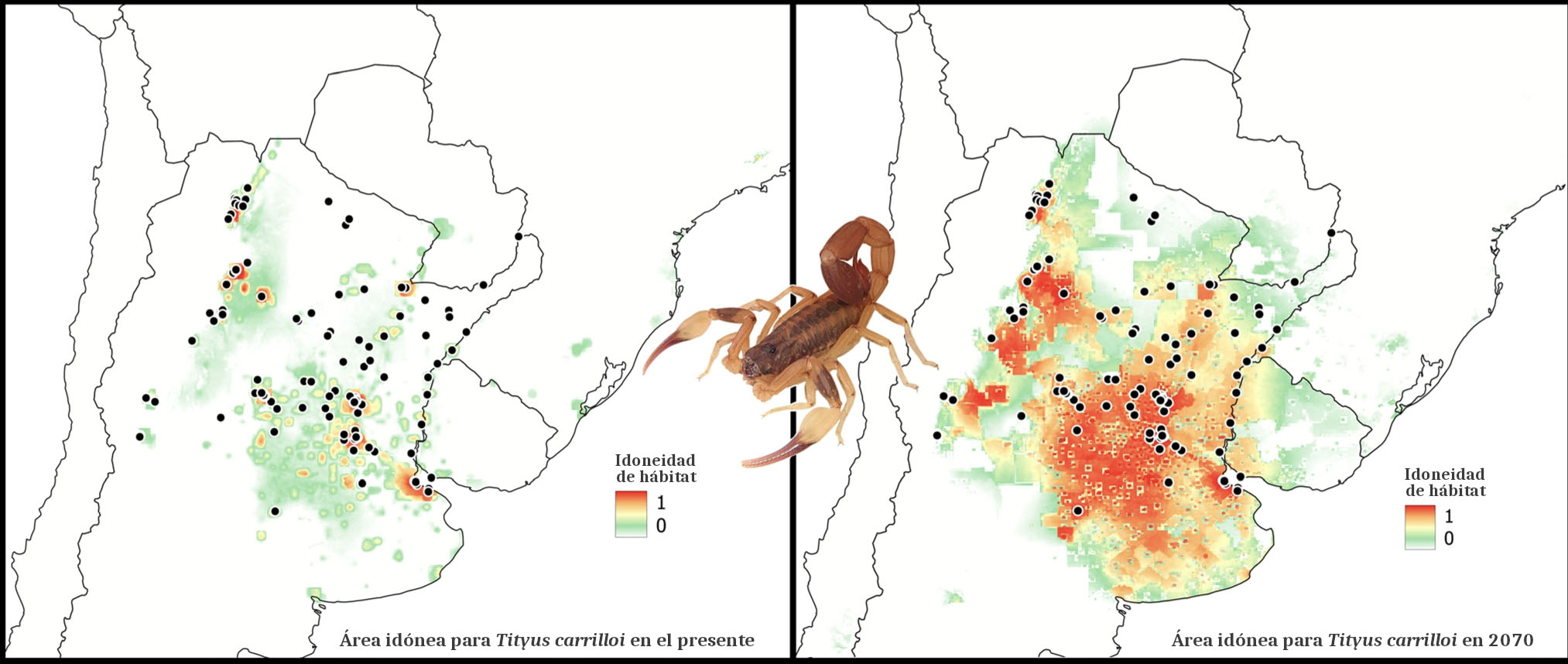 Mapa predictivo de expansión de _Tityus carrilloi_. Tomado de Alexis Barrios.
