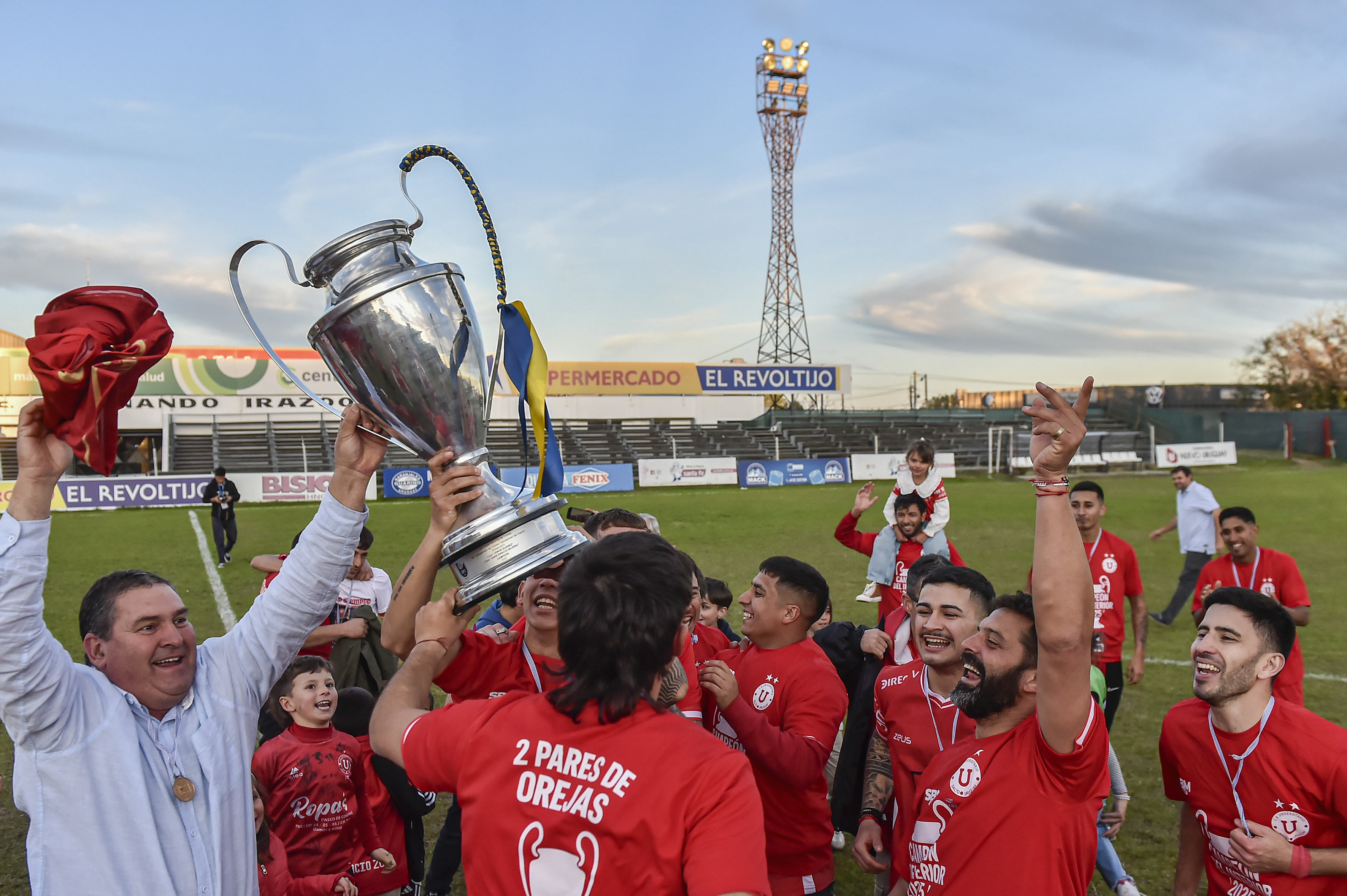Jugadores de Universitario de Salto tras vencer a Río Negro de San José, el 3 de agosto, en el estadio Ernesto Dickinson, en Salto.