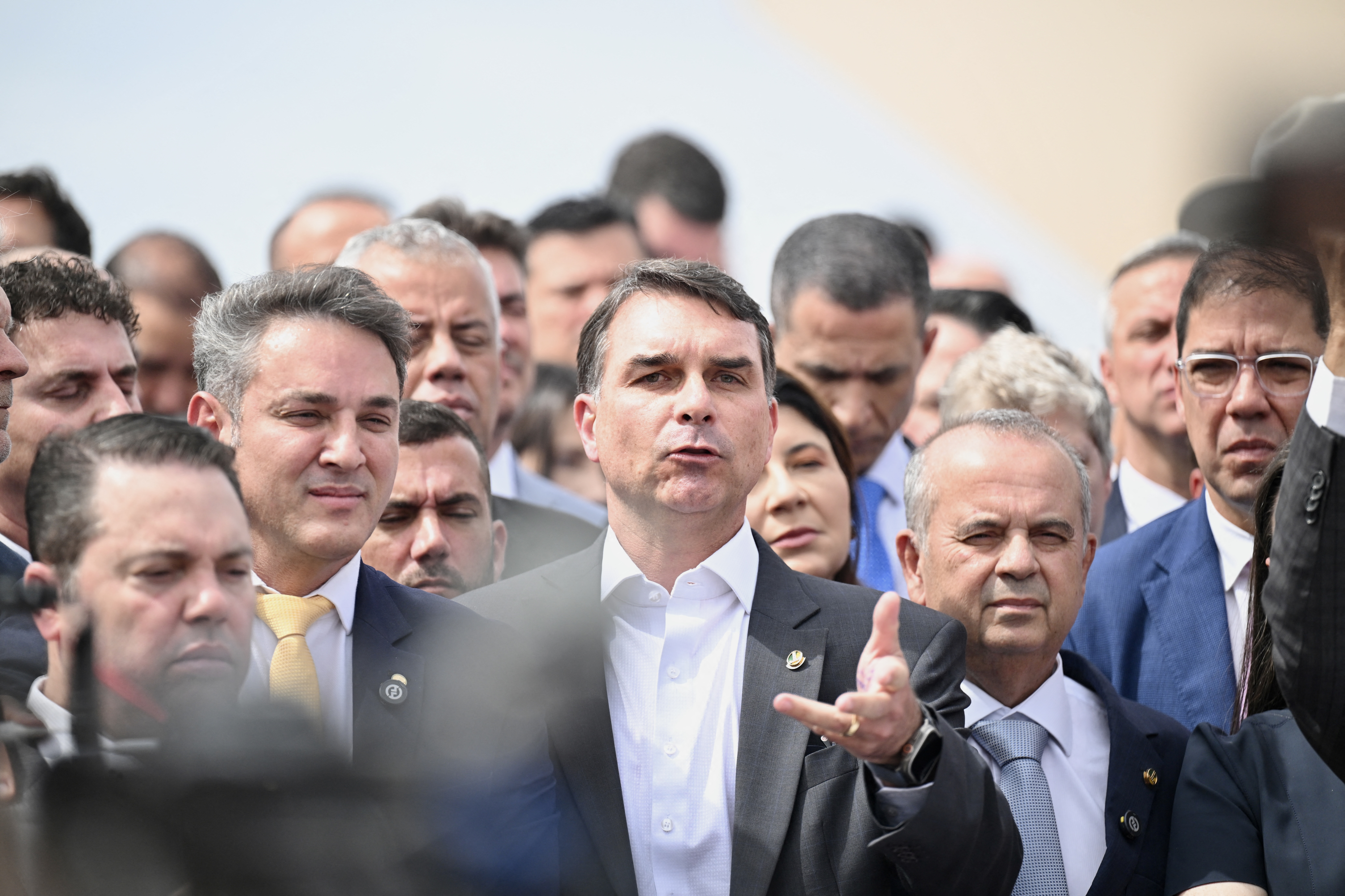 Flávio Bolsonaro (C) durante una rueda de prensa en apoyo a su padre, junto con otros legisladores, el 5 de agosto, frente al Congreso Nacional, en Brasilia.