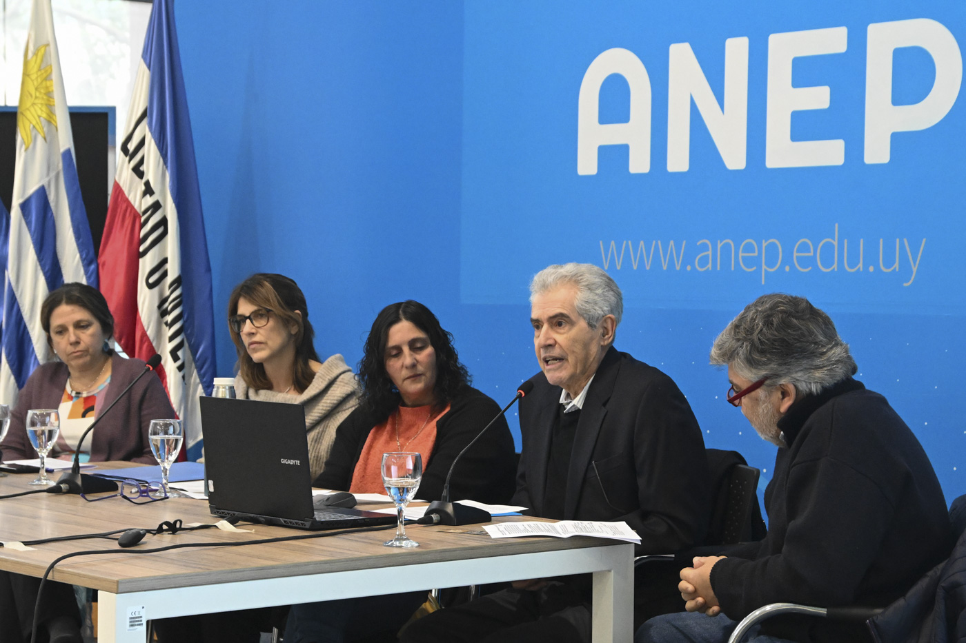 Valeria Ramos, Nilia Viscardi, Carolina Pallas, Luis Yarzábal y Diego Rossi durante el acto de reinstalación de la Comisión de Educación Sexual Integral de la ANEP.