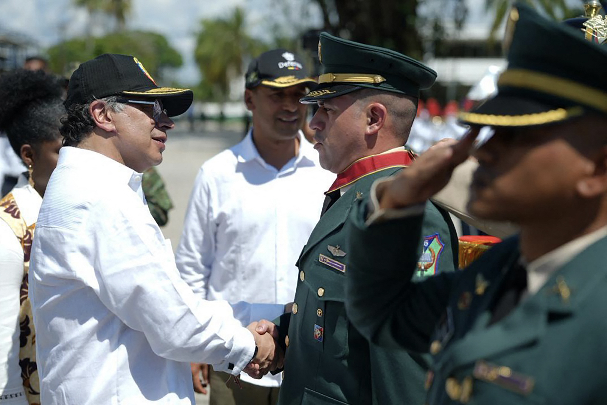Gustavo Petro (i), junto al ejército colombiano durante una ceremonia militar para conmemorar la Batalla de Boyacá de 1819, el 7 de agosto, en Leticia, Colombia.