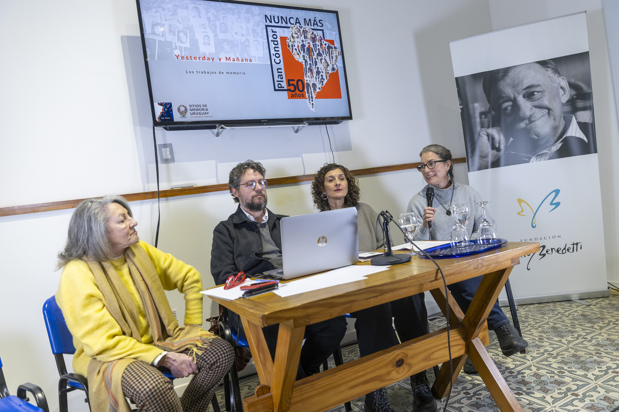 Diane Denoir, Rodrigo Barbano, Mariana Risso y Mariana Achugar, el jueves 7, durante la actividad "Los trabajos de memoria a 50 años del Plan Cóndor”, en la Fundación Mario Benedetti.