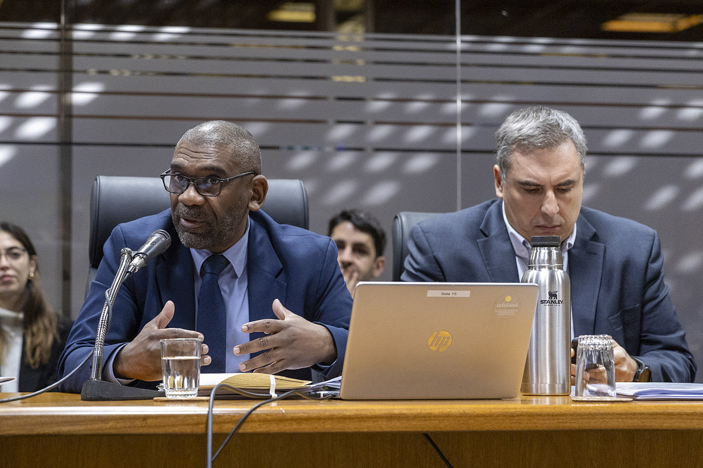 Edgardo Ortuño, ministro de Ambiente, y Pablo Ferreri, presidente de OSE, en la Comisión de Ambiente de la Cámara de Diputados, el 4 de agosto.