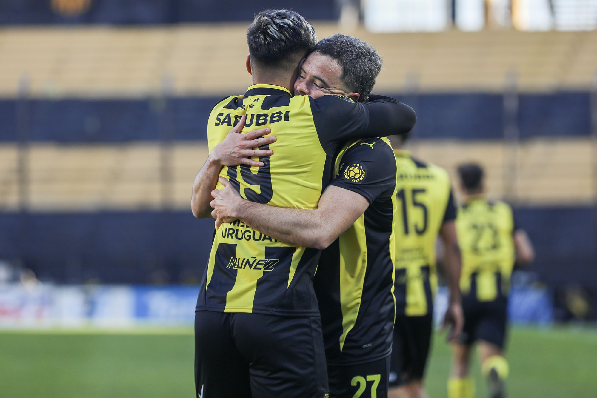 Matías Arezo y Lucas Hernández, celebran el tercer gol de Peñarol, el 9 de agosto, en el estadio Campeón del Siglo.