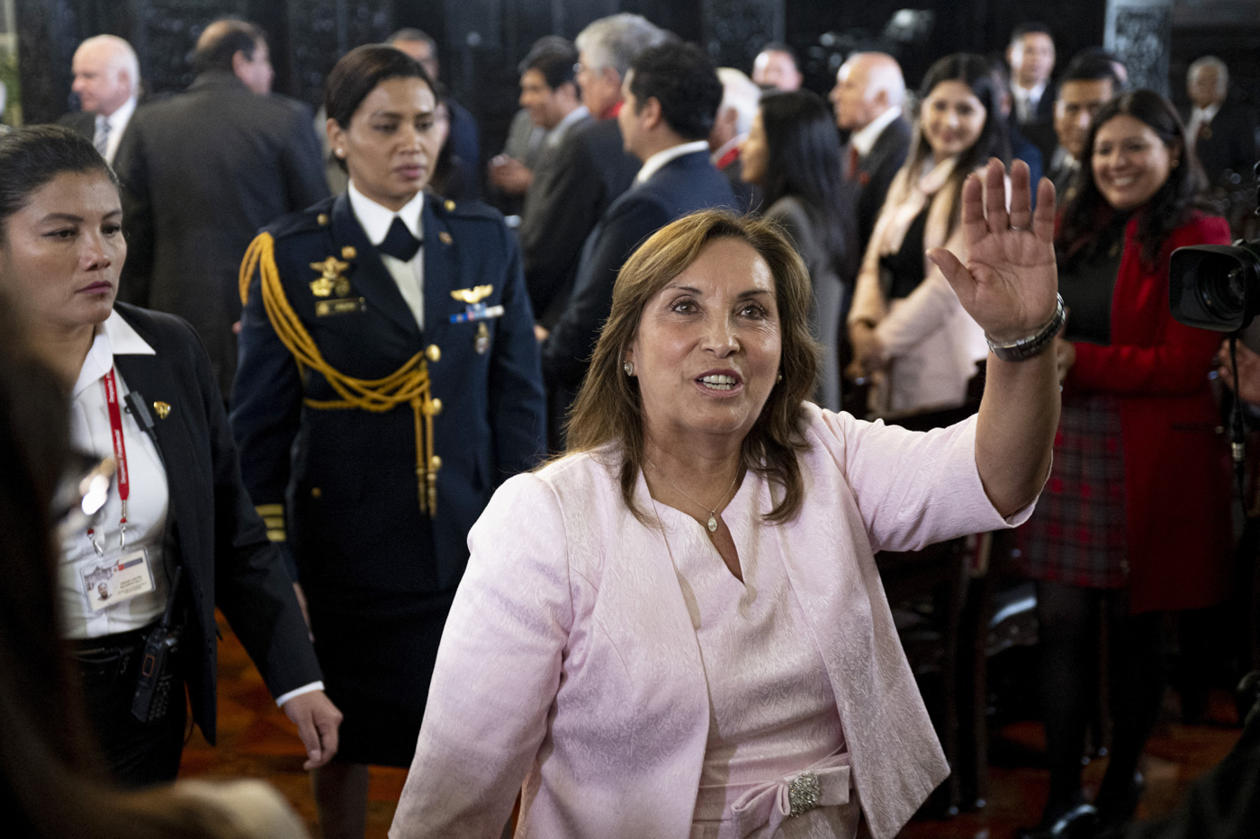 Dina Boluarte, durante la ceremonia de promulgación de Ley de Amnistía para militares y policías procesados por violaciones de derechos humanos, el 13 de agosto, en el Palacio de Gobierno de Lima.