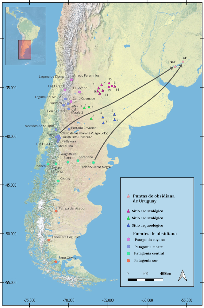 Mapa de canteras de obsidiana y puntas de Uruguay. Tomado de Suárez et al 2025