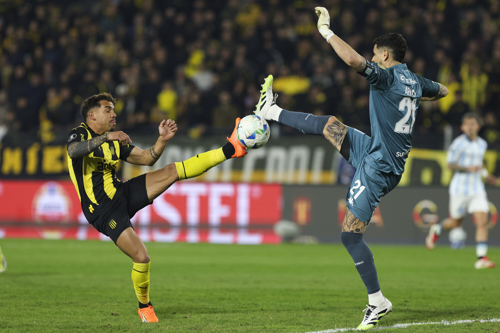 David Terans, de Peñarol, y Gabriel Arias, de Racing, el 12 de agosto, en el estadio Campeón del Siglo.
