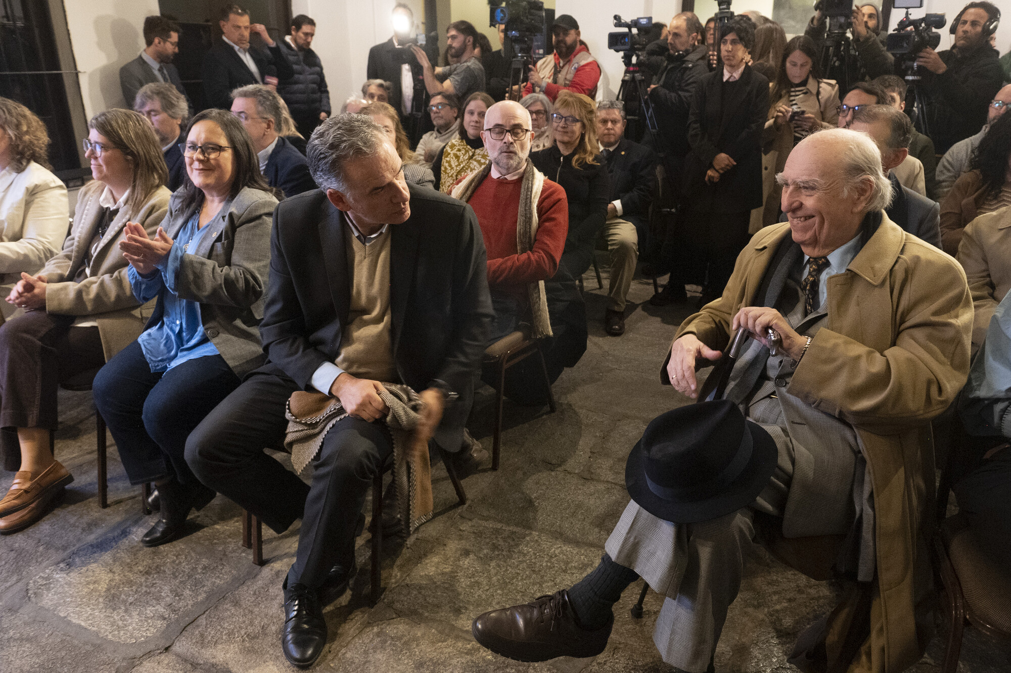 Yamandú Orsi y Julio María Sanguinetti, el 20 de agosto, durante la presentación de la Comisión del Bicentenario, en el Museo Histórico Nacional.