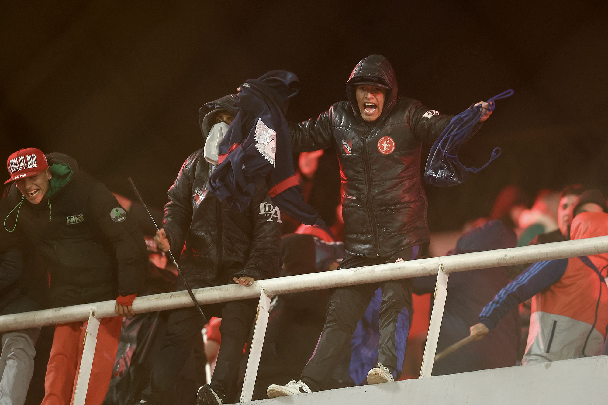Un hincha de Independiente sostiene la ropa de hinchas de la Universidad de Chile durante la interrupción del partido, el 20 de agosto en Avellaneda, provincia de Buenos Aires.
